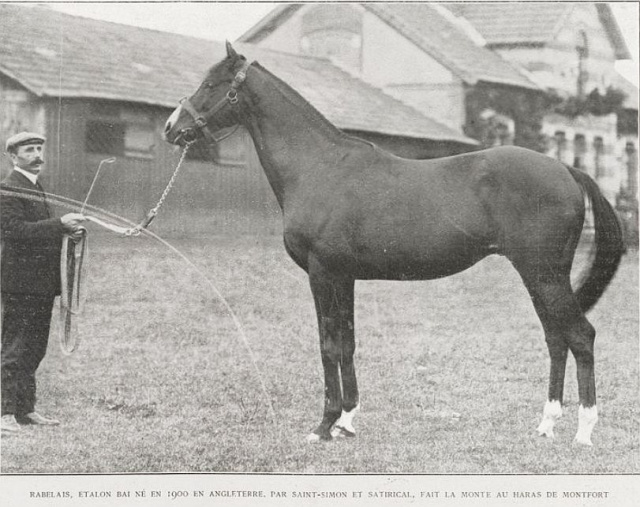 Rabelais won the National Stakes over 5 furlongs as a two-year-old, ran third in the 2000 Guineas behind Rock Sand, fourth in the Derby, and won the Goodwood Cup the same year. As a four-year-old, he was sold to France and became St. Simon's first leading sire in France in 1909, just before Simonian. He repeated the achievement twice more until 1926. Rabelais was a remarkably vital stallion, covering mares at the age of 27 and probably even after. Rabelais died in November 1928, due to complications from a ridiculous surgical procedure in hopes of improving his fertility.