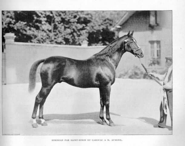 Simonian's best foal was Nuage, the 1910 Grand Prix de Paris winner. He was bought by Graf Lehndorff to stand in Germany and led the sires' list from 1915 to 1917. More importantly, he was a damsire of Alchimist, Aditi (damsire of Ticino), and the third sire of Arjaman (damsire of Nebelwerfer and Neckar).