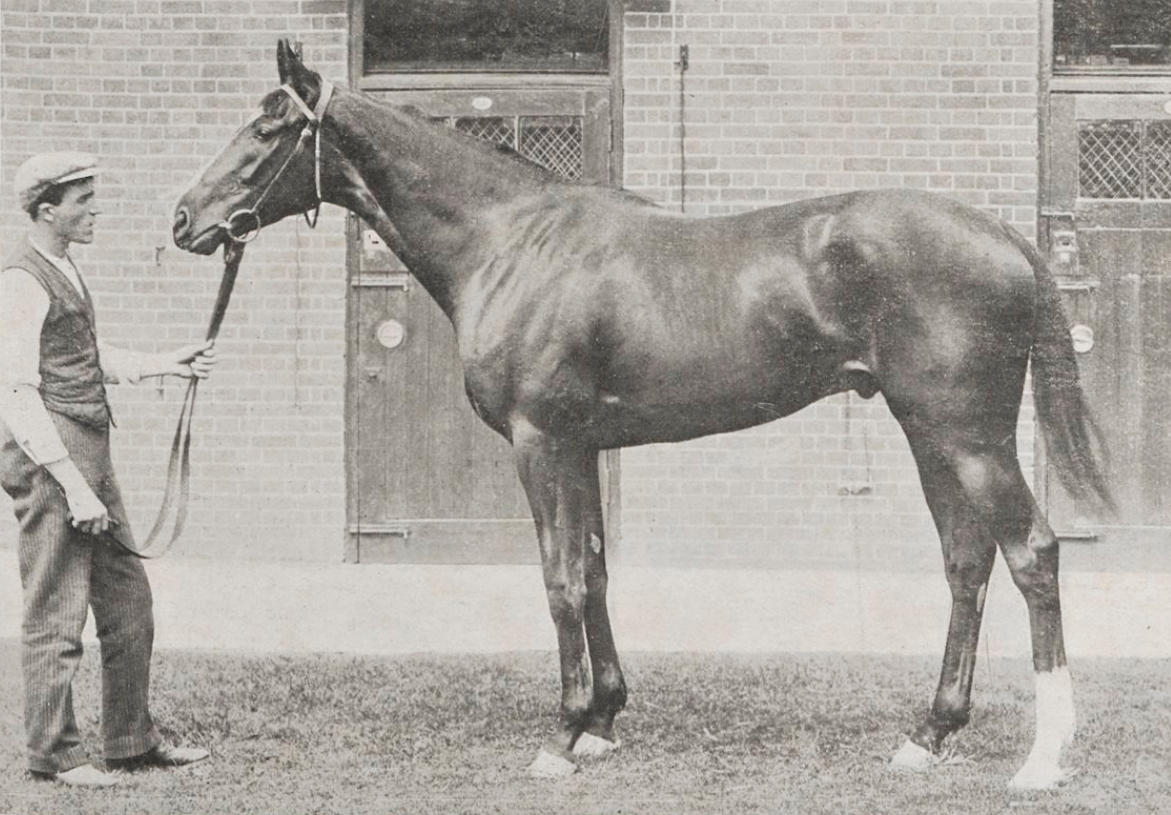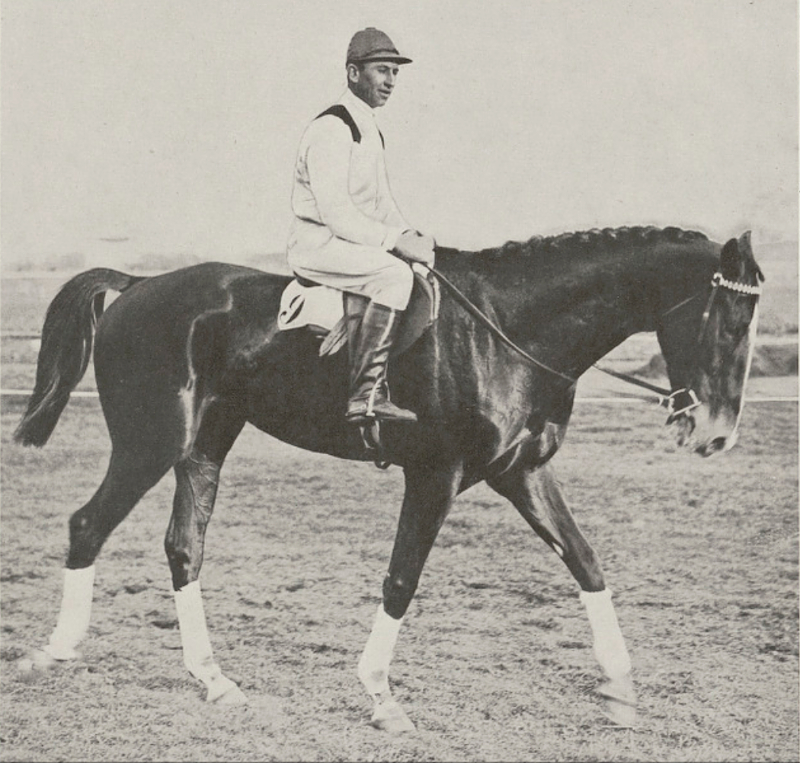 The picture of Borrow is one of the real jewels you sometimes get to find - in this case, in an old French magazine. As his sire Hamburg suggests, Borrow was an American horse, bred and owned by Harry Payne Whitney. The photo was taken in 1910, when Borrow was a two-year-old, and further examination revealed that he was a hell of a racehorse in England, winning the Middle Park Stakes - and the top English race sure had the same reputation as it does today. Even more interestingly, Borrow also dead-heated for the minor Hopeful Stakes - and the co-winner was Sunstar, the future Two Thousand Guineas and the Epsom Derby winner!